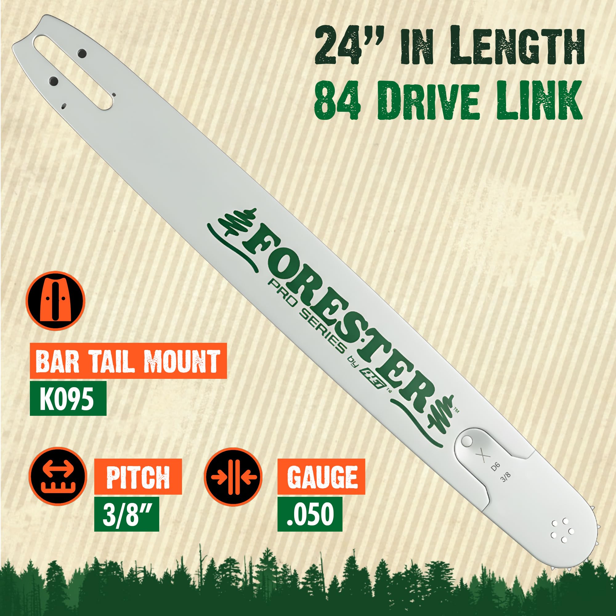 FORESTER 24in Professional Chainsaw Bar for Husqvarna with Sprocket Nose | 24in Length, 3/8” Pitch, .050 Gauge, K095 Mount, 84 Drive Link | Replacement Chain Saw Parts for Husqvarna, Jonsered, Dolmar—