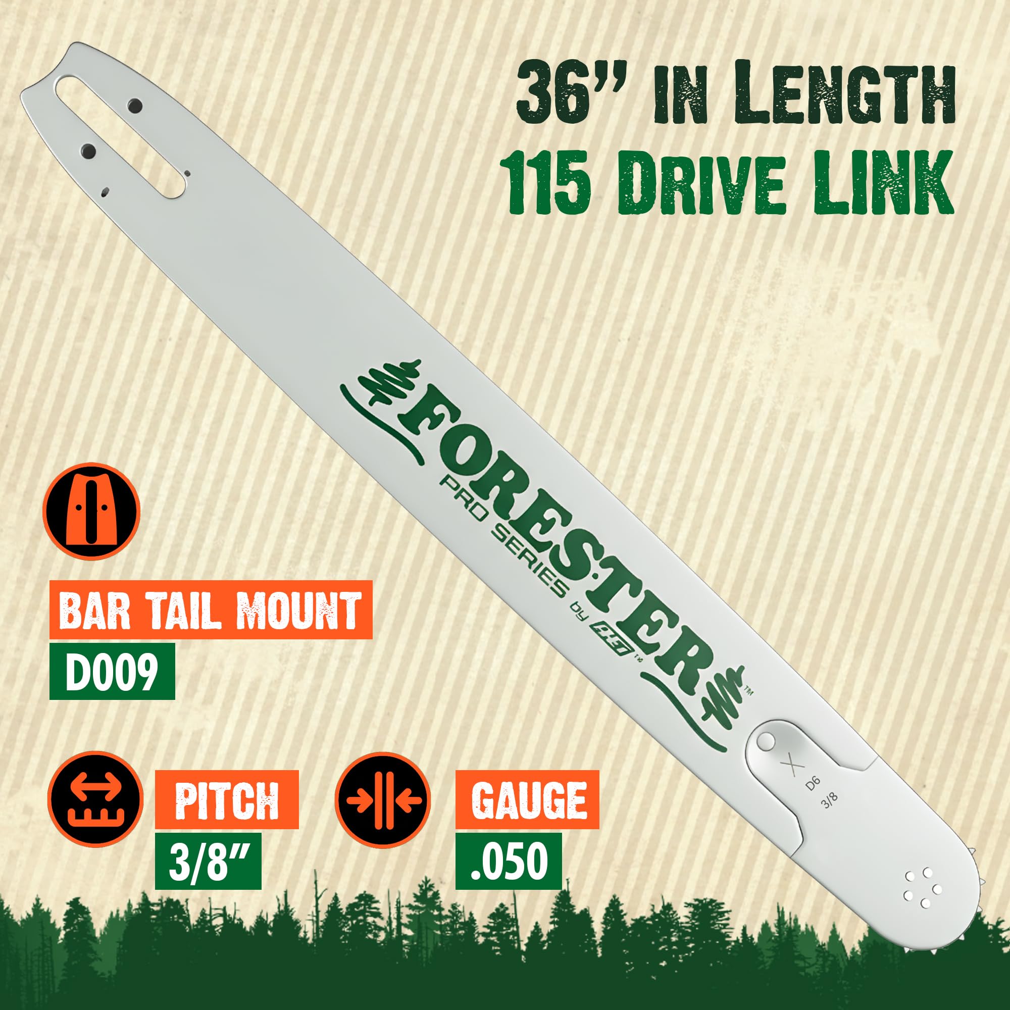 - SPECIFICATIONS: 36in Length, D009 Bar Tail Mount, 3/8 Pitch, .050 Gauge, 115 Drive Link