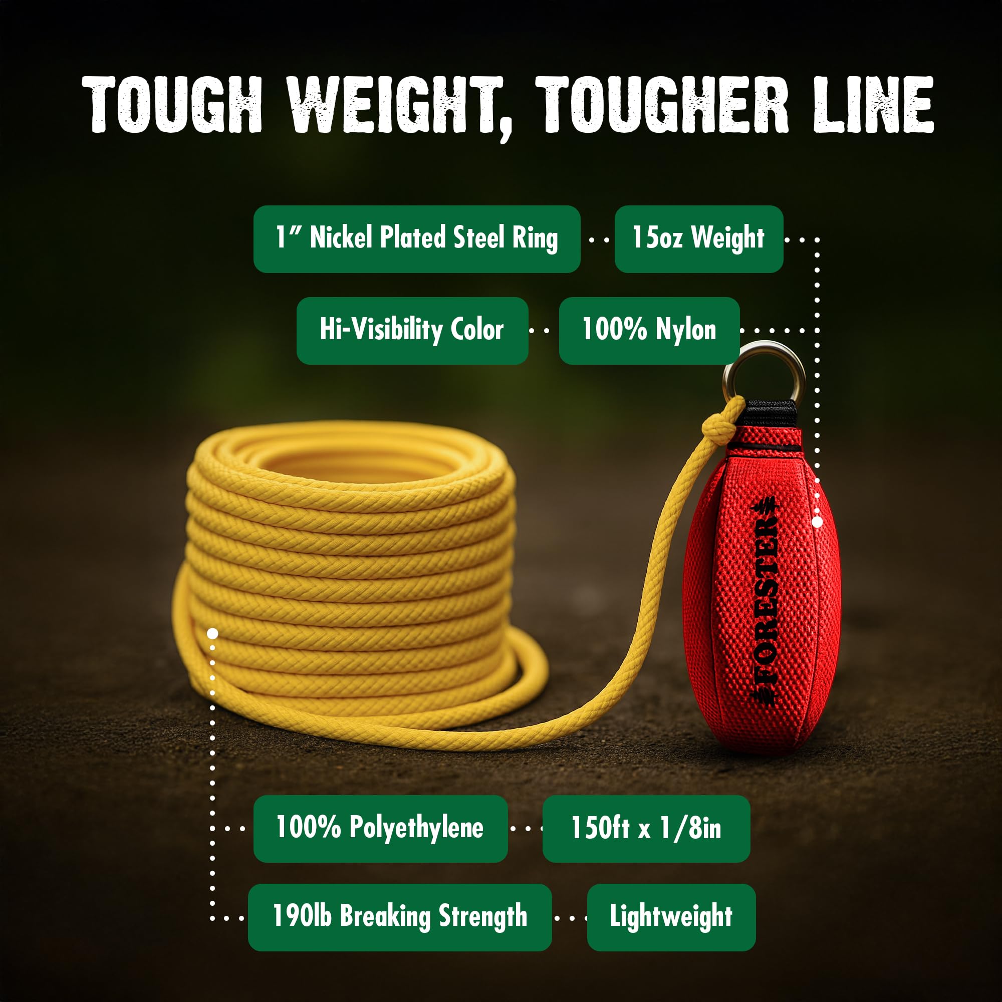 - INCLUDED ARBORIST THROW LINE BAG - This kit comes with a compact and rugged Forester pint-sized throwline carry bag made from 600 denier nylon, featuring a durable design and convenient drawstring top for easy access